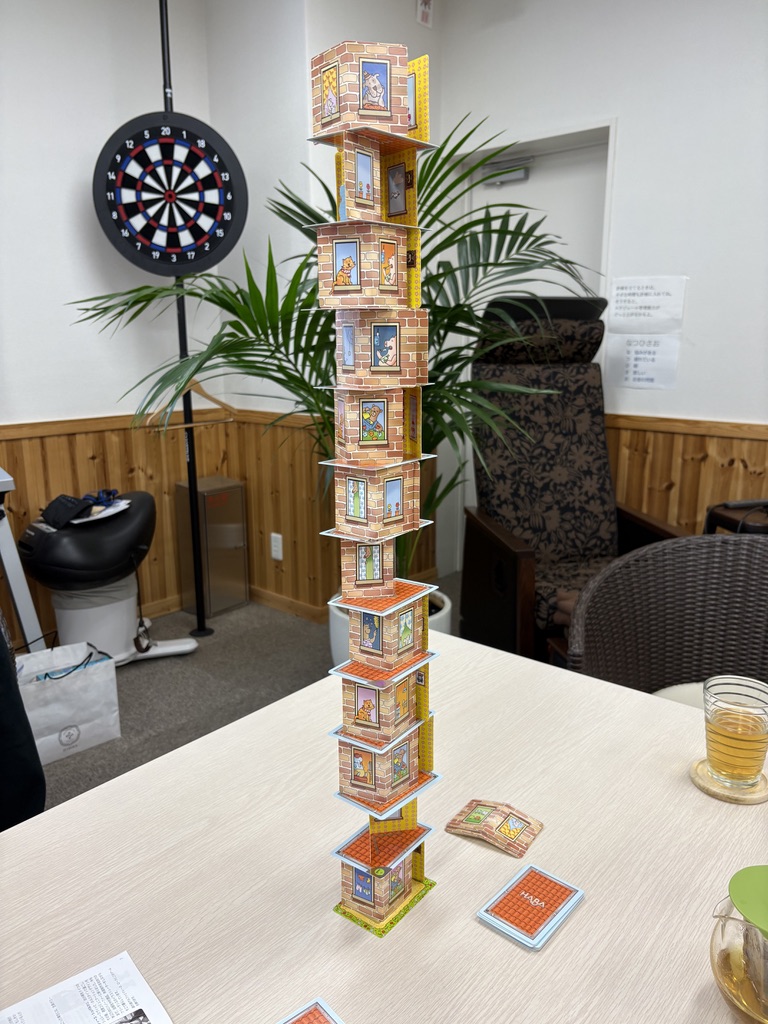 ゲームの目的は、プレイヤー全員で協力してタワーを高く積み上げながら、スーパーヒーロー「リノ」のフィギュアを天井まで導くこと。慎重さ、バランス感覚を発揮し、勇気を持ってタワーを積み上げていくゲームです。全ての屋根カードを使い切り、リノが登りきれば全員の勝利!!みんなに意見を聞きながら、カードやフィギュアを積み上げました。