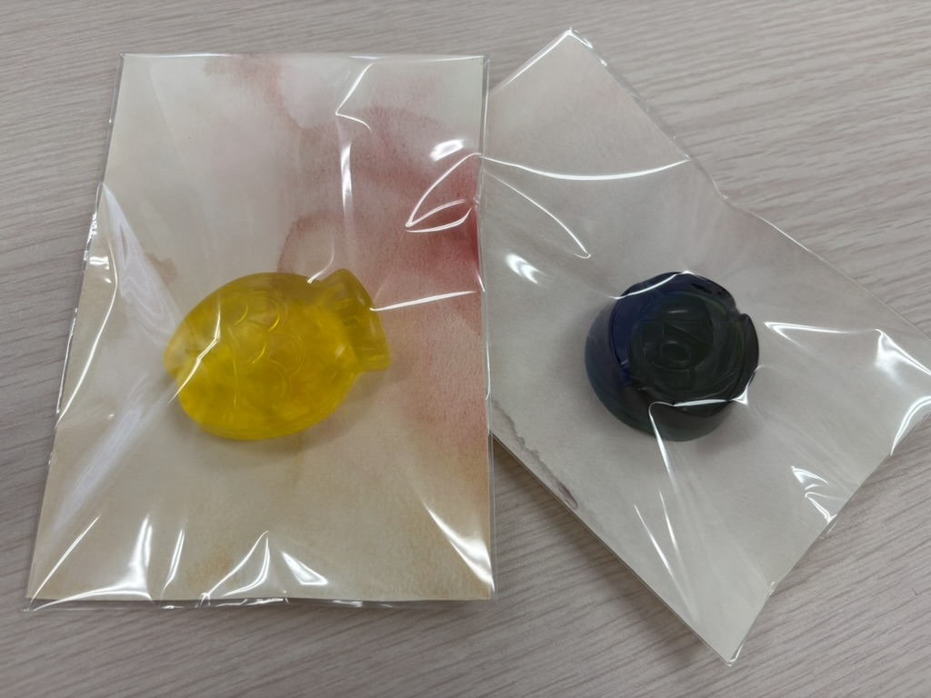 下の写真は、以前マーブリングのプログラムで作った台紙を使ってラッピングしたものです。使うと柄が消えちゃうから勿体無い!なんて気持ちにもさせてくれる石鹸が完成しました。みんなでわちゃわちゃ作業するのも楽しかったですね。